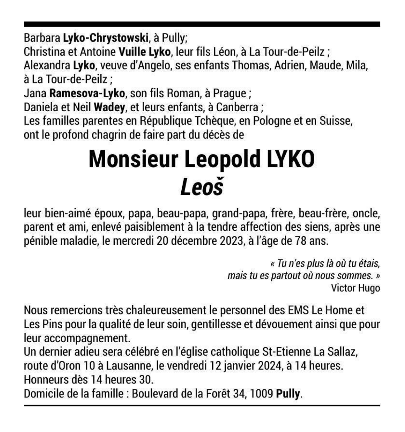 Monsieur Leopold LYKO Leoš 21 juin. 1945 - 20 déc. 2023 Avis mortuaire PFG Télecharger PDF Partager sur: Galerie PreviousNext PreviousNext