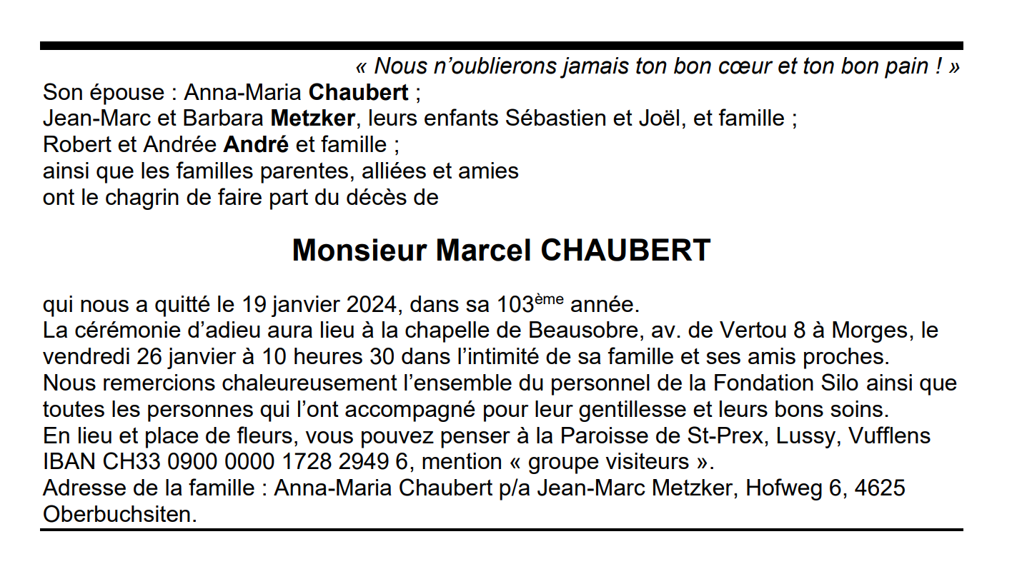 Monsieur Marcel CHAUBERT 19 juin. 1921 - 19 jan. 2024 Avis mortuaire PFG Télecharger PDF Partager sur: Galerie PreviousNext PreviousNext