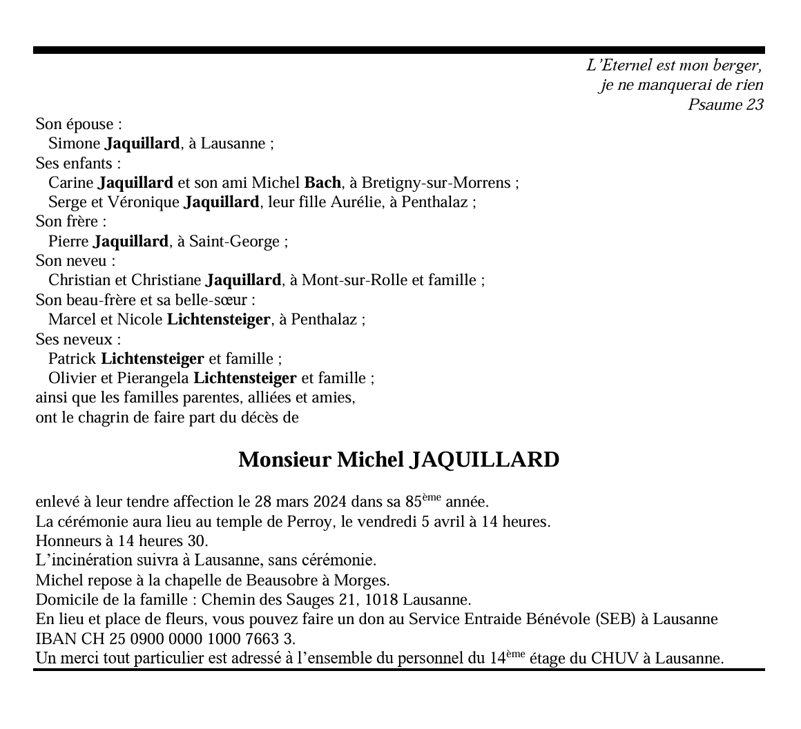 Monsieur Michel JAQUILLARD 29 avr. 1939 - 28 mar. 2024 Avis mortuaire PFG Télecharger PDF Partager sur: Galerie PreviousNext PreviousNext