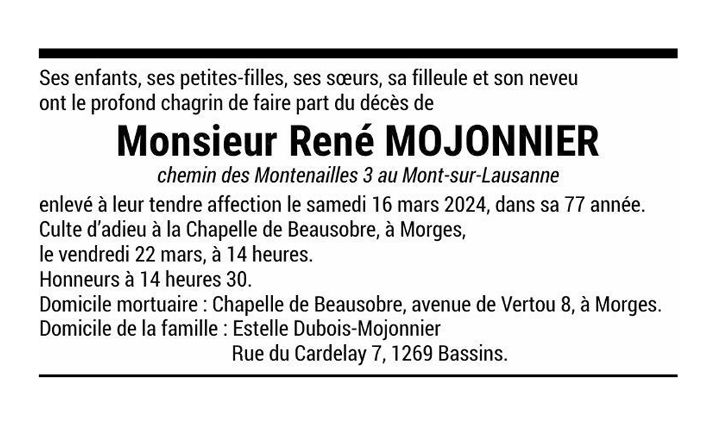 Monsieur René MOJONNIER 02 aoû. 1947 - 16 mar. 2024 Avis mortuaire PFG Télecharger PDF Partager sur: Galerie PreviousNext PreviousNext