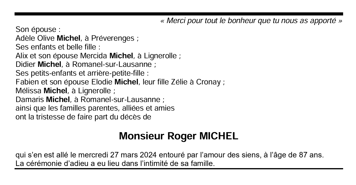 Monsieur Roger MICHEL 18 mar. 1937 - 27 mar. 2024 Avis mortuaire PFG Télecharger PDF Partager sur: Galerie PreviousNext PreviousNext