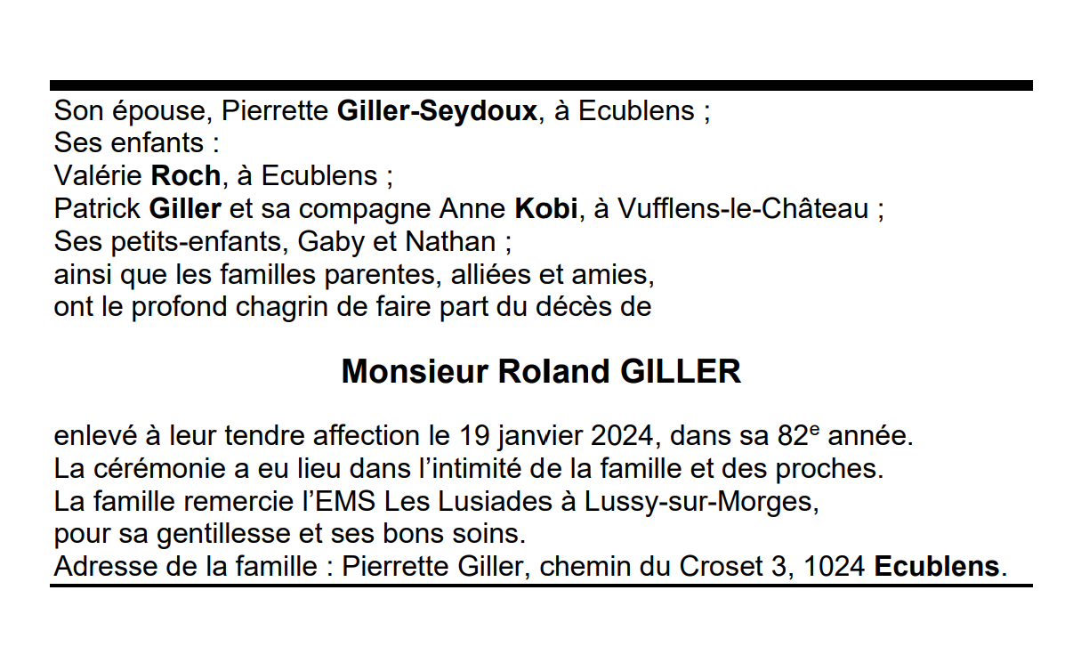 Monsieur Roland GILLER 10 avr. 1942 - 19 jan. 2024 Avis mortuaire PFG Télecharger PDF Partager sur: Galerie PreviousNext PreviousNext