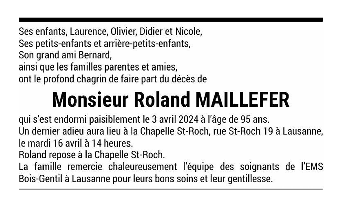 Monsieur Roland MAILLEFER 10 mar. 1929 - 03 avr. 2024 Avis mortuaire PFG Télecharger PDF Partager sur: Galerie PreviousNext PreviousNext