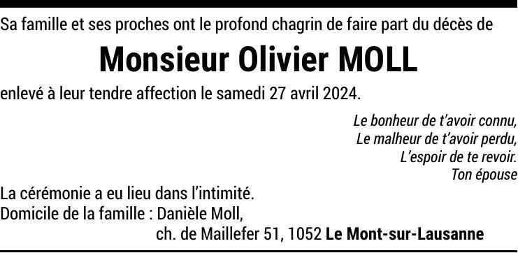 Olivier MOLL 17 aoû. 1943 - 27 avr. 2024 Avis mortuaire PFG Partager sur: Galerie PreviousNext PreviousNext