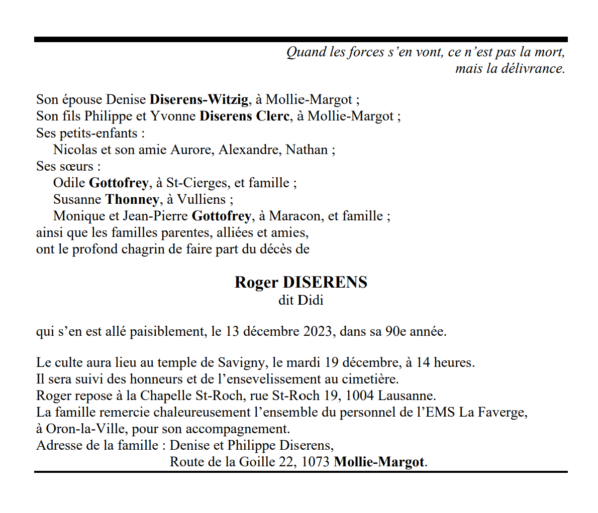 Roger DISERENS dit Didi 21 jan. 1934 - 13 déc. 2023 Avis mortuaire PFG Télecharger PDF Partager sur: Galerie PreviousNext PreviousNext