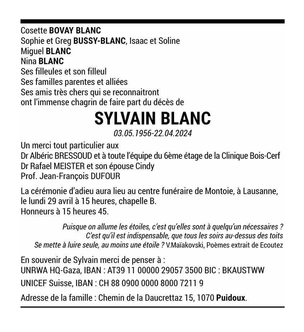 SYLVAIN BLANC 03 mai. 1956 - 22 avr. 2024 Avis mortuaire PFG Télecharger PDF Partager sur: Galerie PreviousNext PreviousNext