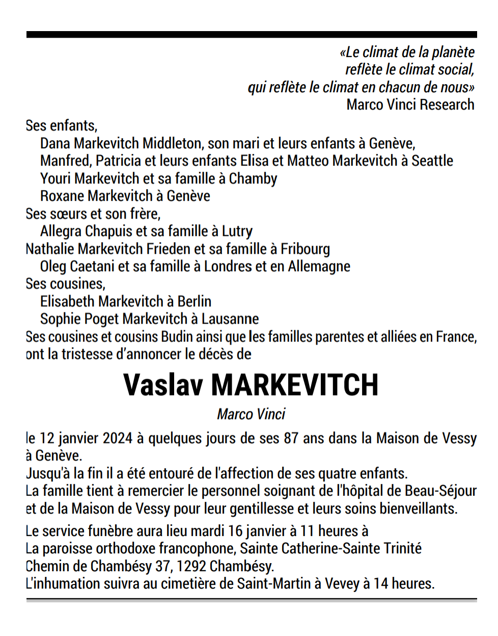 Vaslav MARKEVITCH, Marco Vinci 12 jan. 2024 Avis mortuaire PFG Télecharger PDF Partager sur: Galerie PreviousNext PreviousNext
