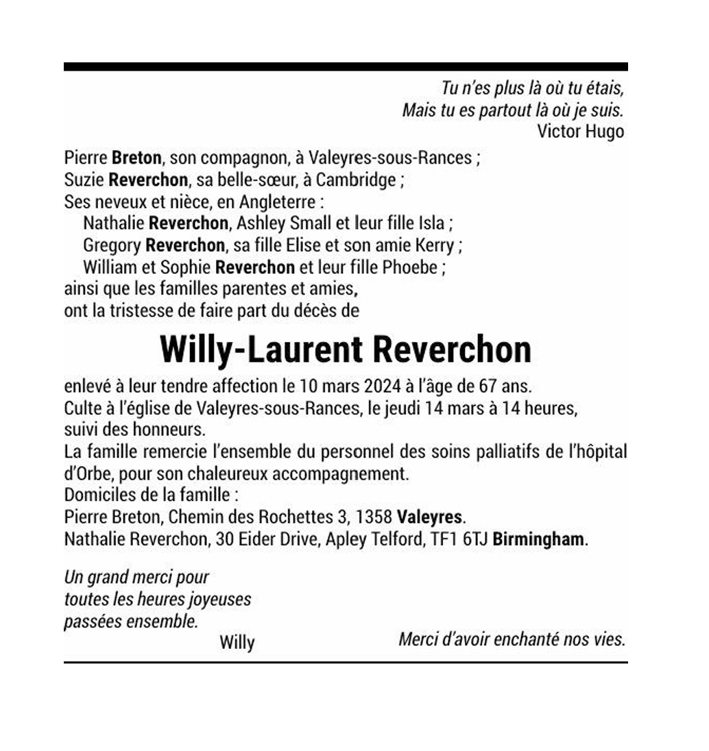Willy-Laurent Reverchon 23 juil. 1957 - 10 mar. 2024 Avis mortuaire PFG Télecharger PDF Partager sur: Galerie PreviousNext PreviousNext